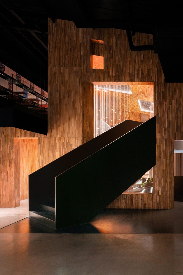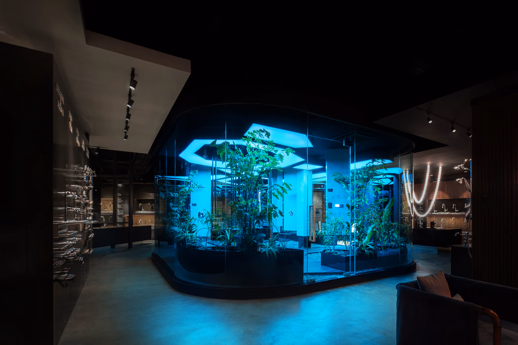 A showroom project that sells a collection of premium interior and exterior materials. We began from the concept of “Interstellar,” where we wanted to make visitors feel as if they are being taken into various dimensions of space and time. We created “water, earth, and sky” to separate each floor and giant main stairs to connect the three elements.